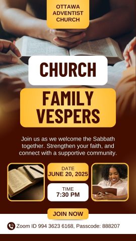 Join us at 7:30 p.m. for a blessed evening as we welcome the Sabbath together! This month, our cherished Elders will lead our Church Family Vespers. Invite a friend and come experience spiritual connection, fellowship, and heartwarming worship. We can't wait to see you there!