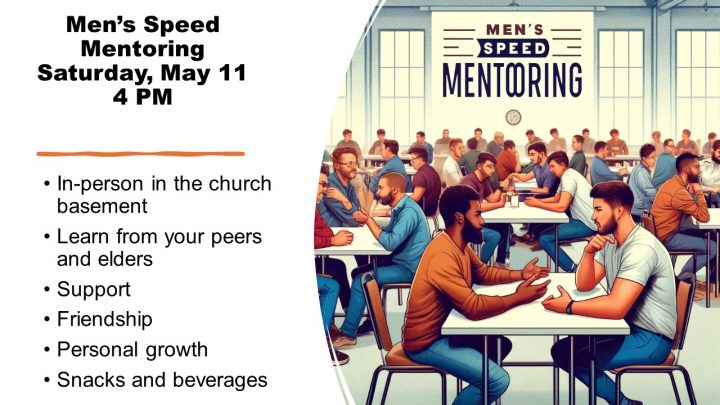 Men’s Speed Mentoring, scheduled for May 11 at 4:00 p.m. in the fellowship hall has been postponed. Stay tuned for a new date.
