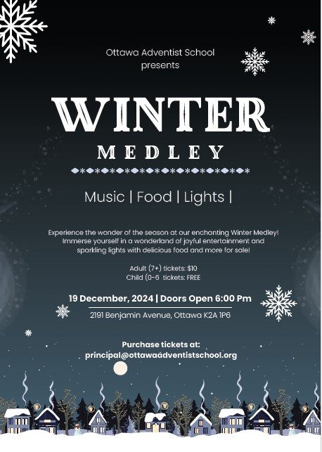 As we approach the end of the year, we would like to share a delightful treat to warm your hearts! You are cordially invited to the Ottawa Adventist School's Winter Concert on December 19, 2024, at 6:30 PM.