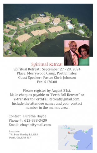 Spiritual Retreat with Pastor Chris Johnson. The cost is $170.00; includes food and lodging. Cheques can be made payable to “Perth Fall Retreat” or e-transfer to PerthFallRetreat@gmail.com.” For enquiries, contact Elder Jean V. at 613-836-5673, or Euretha Hayde at 613-838-3439; ehayde@ymail.com
