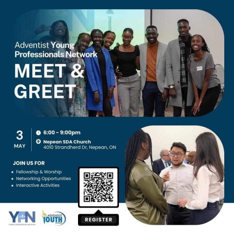 The Adventist Young Professional Network (YPN) is holding a meet and greet this Friday, May 3 from 6:00 p.m. to 9:00 p.m. at the Nepean Adventist Church. Come fellowship, network, and connect with other young professionals.