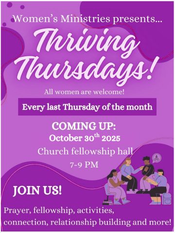Women’s Ministries “Thriving Thursdays” resumes on October 30 in the church basement from 7:00 p.m. - 9:00 p.m. Join us at the Breathing Nest: a calm space to come experience a moment of peace, prayer, and creative arts.