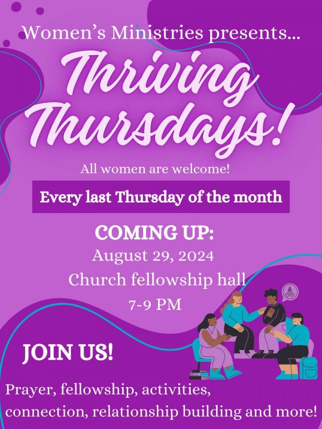 Women’s Ministries presents “Thriving Thursdays” for women, which takes place the last Thursday of every month. Join us from 7:00 p.m. to 9:00 p.m. in the church’s lower hall for a fun social gathering to build relationships and participate in activities.