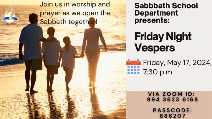 Sabbath School ministries will host this month’s Church Family Vesper at 7:30 p.m. The church family vespers are held the third Friday of every month. Come and be blessed as we welcome the Sabbath together! Please feel free to invite a friend and share this information with other members.